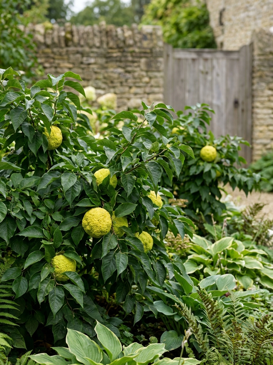 Die Frucht sieht einem grünlich-gelben Orange sehr ähnlich, ist aber nicht essbar.