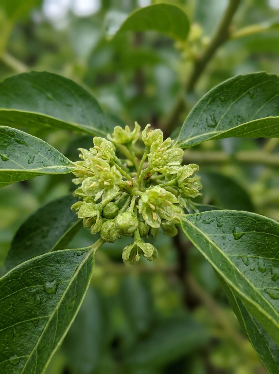 Die Zweige sind sehr dornig, die Blätter sehr groß und die Blüte unauffällig.