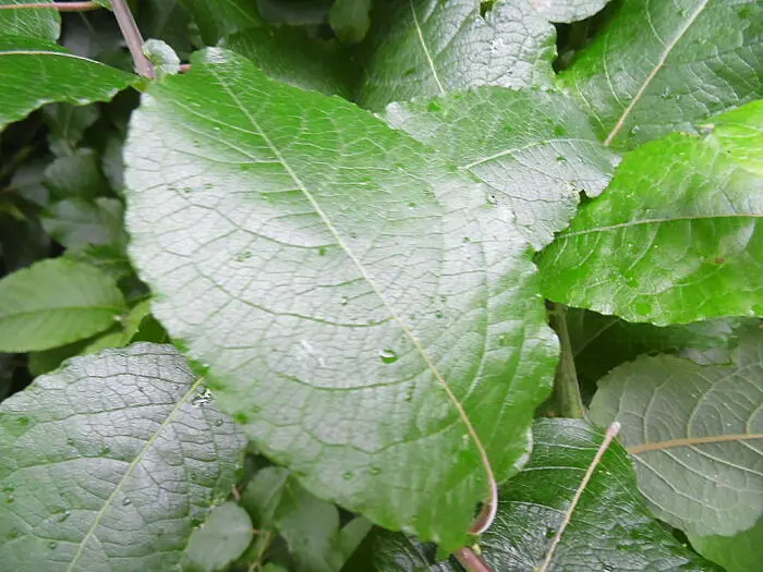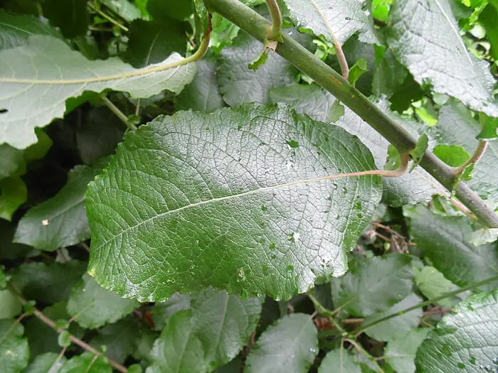 Die Blätter sind breiter als bei den anderen Arten, haben eine elliptische Form und der Blattrand ist leicht wellig und intakt.