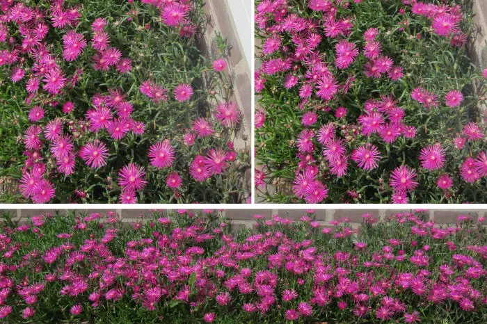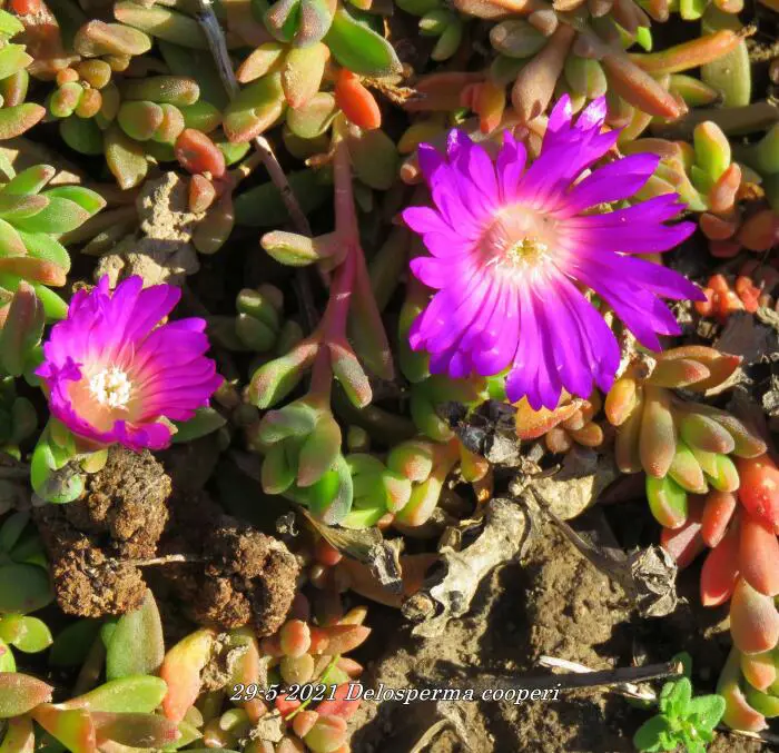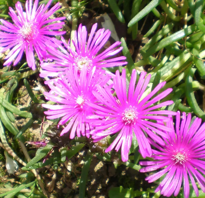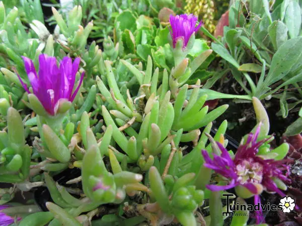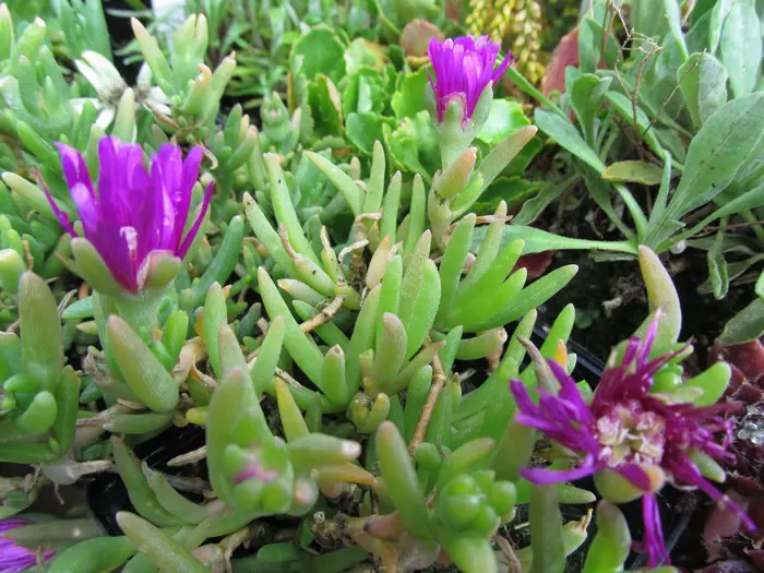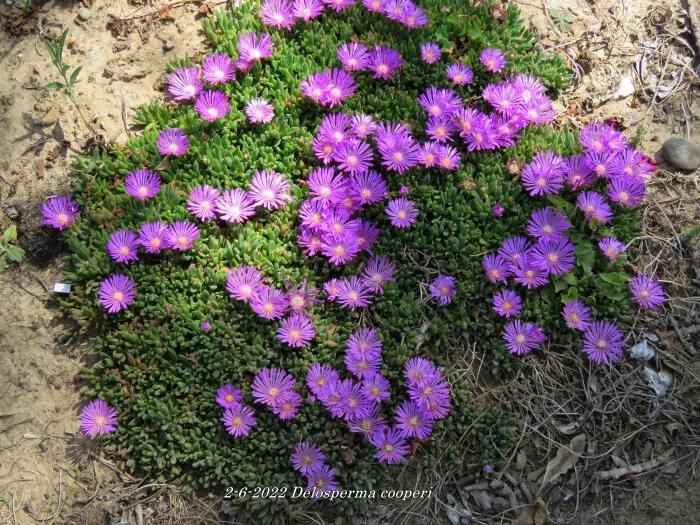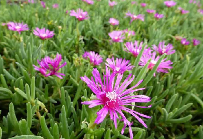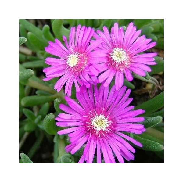 Delosperma cooperi ist eine reich blühende, aber kurzlebige Pflanze mit glümchenartigen, violettrosa Blüten und einem weiß-gelben Zentrum.