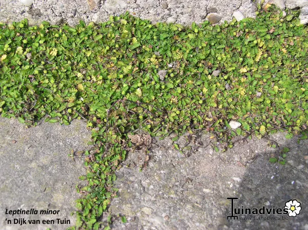 Leptinella minor, heimisch in Neuseeland, ist eine sehr kleine Bodendecke von 2 cm Höhe.