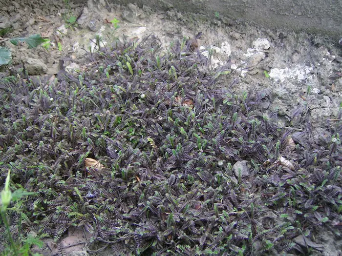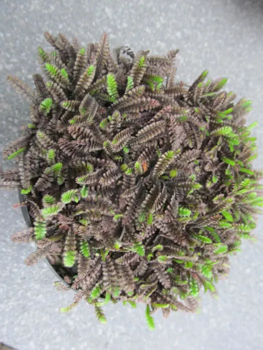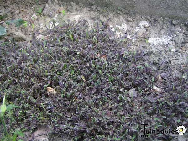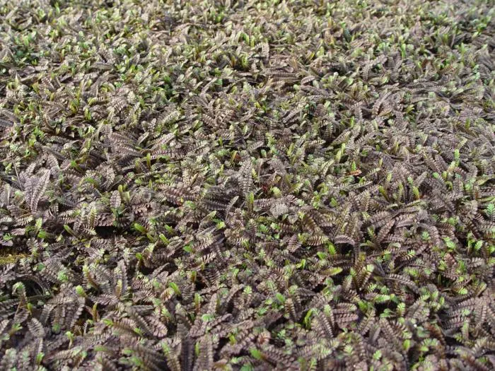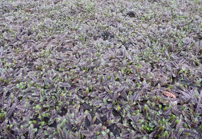 Sauerbildende Pflanze, die kaum eine Höhe von 5 cm erreicht, mit sehr kleinen, farnartigen bräunlich-schwarzen Blättern.