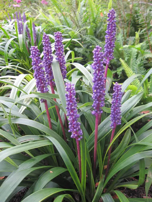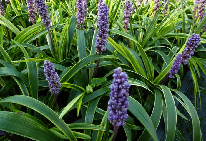 Liriope muscari 'Gold Band' bildet einen Büschel grasigen, gelb/grün variegierten Blätter und blüht mit wunderschönen aufrechten violett-violetten Stacheln.