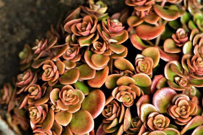 Bildet eine sich ausbreitende Matte mit kleinen Rosetten aus tiefgrünen, fleischigen Blättern, die im Herbst zu Bronze und im Herbst zu Rot zu Orange werden.