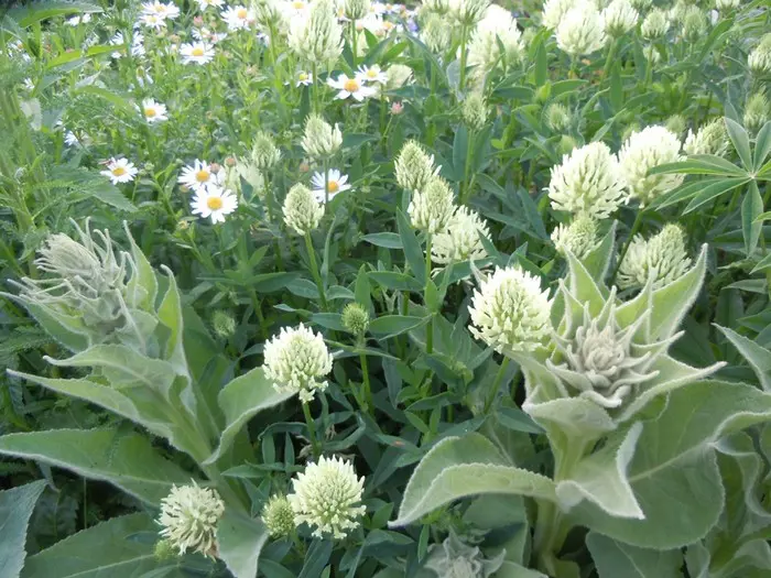 Die Blüten haben kugelförmige Köpfe, sind cremeweiß, manchmal rosa.