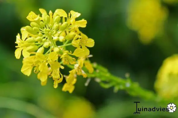 Schwarzer Senf kann bis zu 200 cm hoch werden und hat grün gelappte Blätter mit gelben Blüten.
