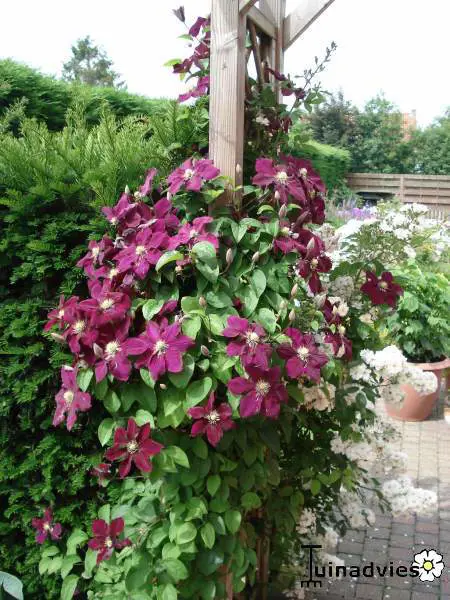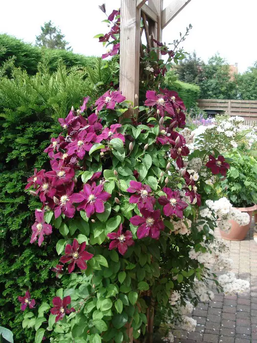 Clematis 'Rosemoor' ist eine frühblühende große Clematis mit dunkelroten Blüten und gelben Staubblättern.