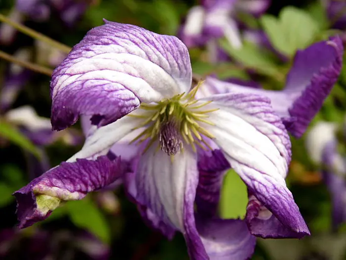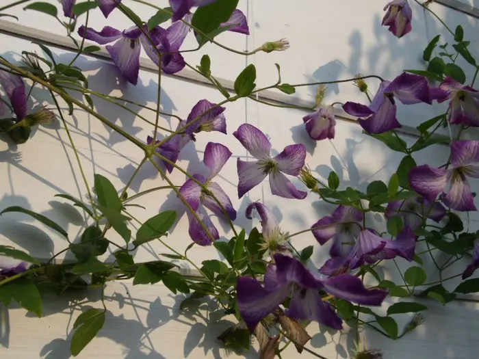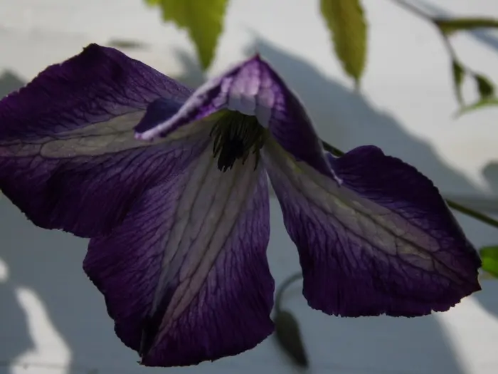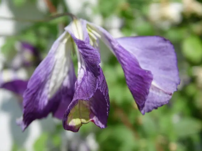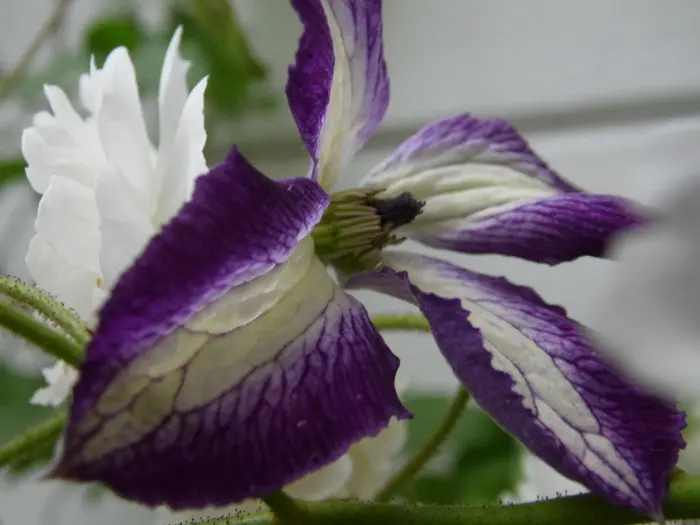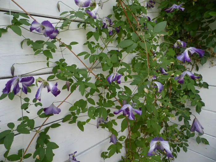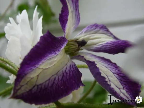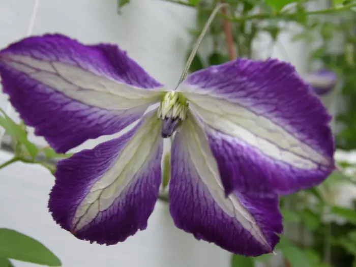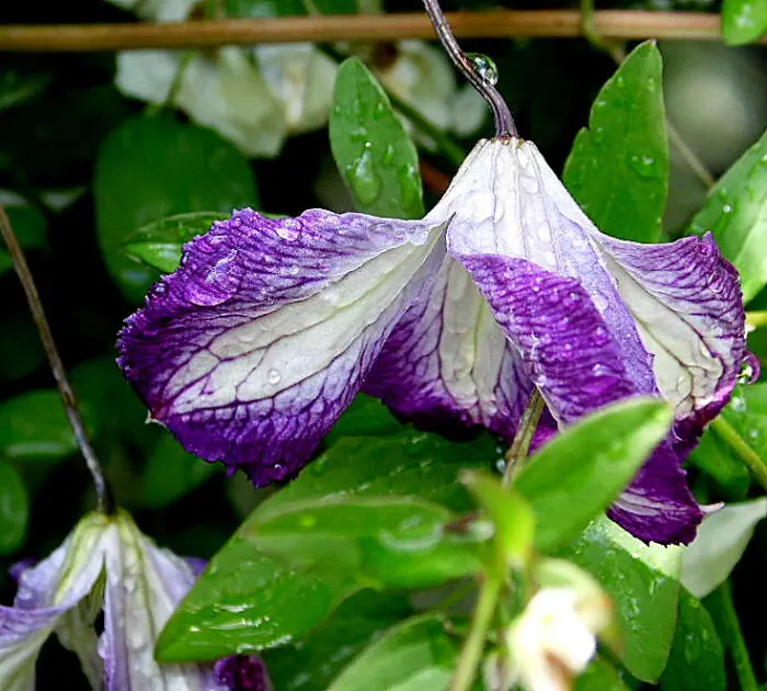 'I Am Lady J' ist eine Clematis aus der Viticella-Gruppe und blüht mit nickenden, offenen, glockenförmigen Blüten, weiß mit breiten violetten Rändern. Sie wird 250 cm hoch.Nach dem Winter auf 30 cm zurückschneiden. (Schnittgruppe 3)