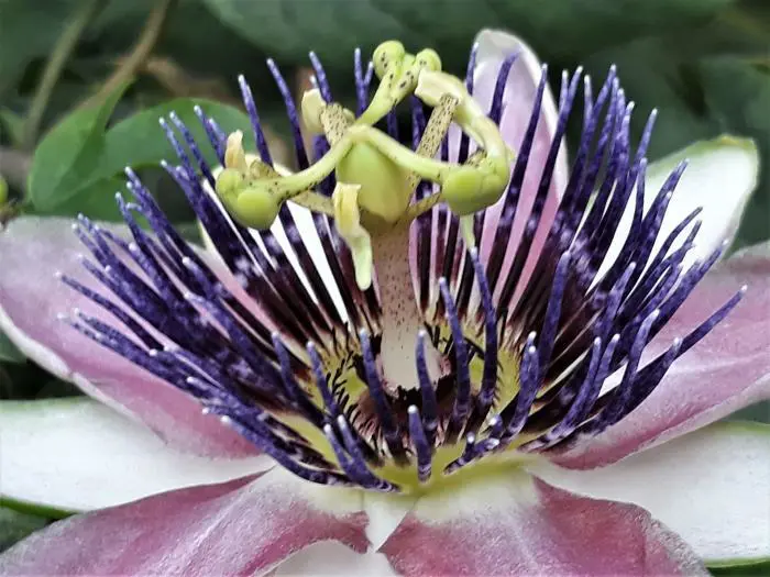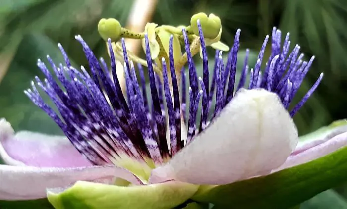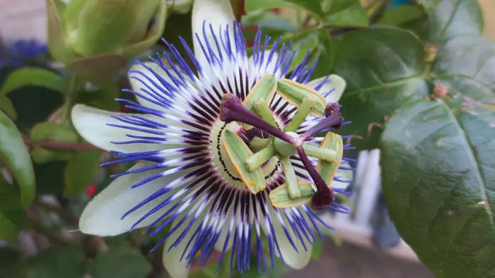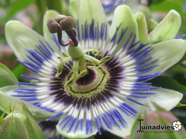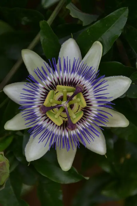 Die Blüte hat weiße Kelchblätter und Blütenblätter sowie eine violett-blaue Korona.