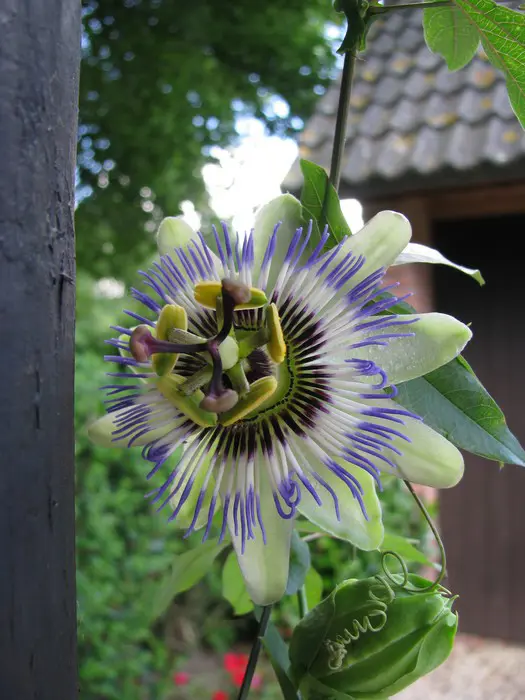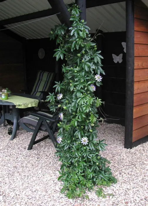 Passiflora sind Kletterpflanzen. Mit ihren Ranken können sie sich um alles drehen. Deshalb ist es am besten, sie geschützt vor einer sonnigen, warmen Wand oder einem Zaun vor dem Wind zu pflanzen. Da sie Bäume und andere Pflanzen in der Wildnis als Unterstützung nutzen, haben sie keinen stabilen Stamm. Dennoch können sie in einer Sommersaison bis zu 6 Meter hoch werden. Wenn du mit Gartendraht, Drahtgeflecht oder anderem Klettergerät arbeitest, können sich die Pflanzen leicht selbst anheften. Aber lass sie ihren eigenen Weg finden.