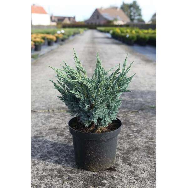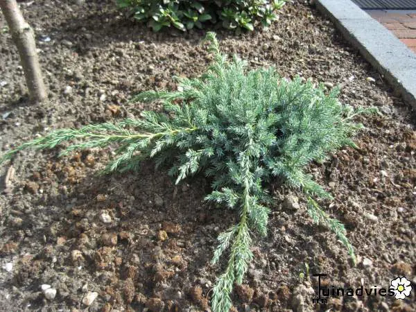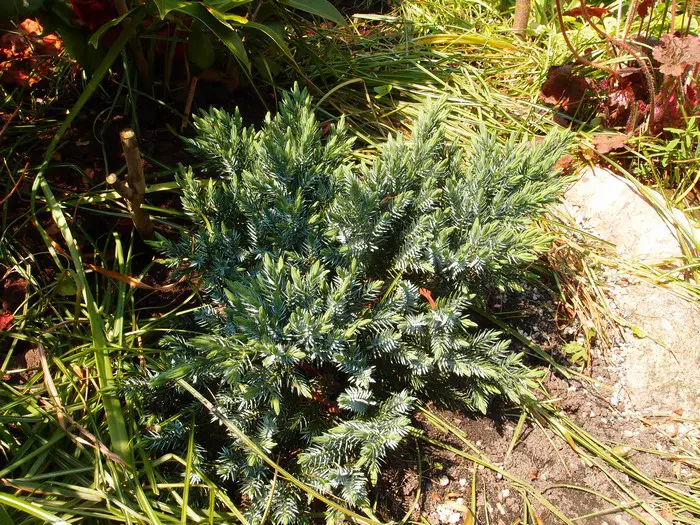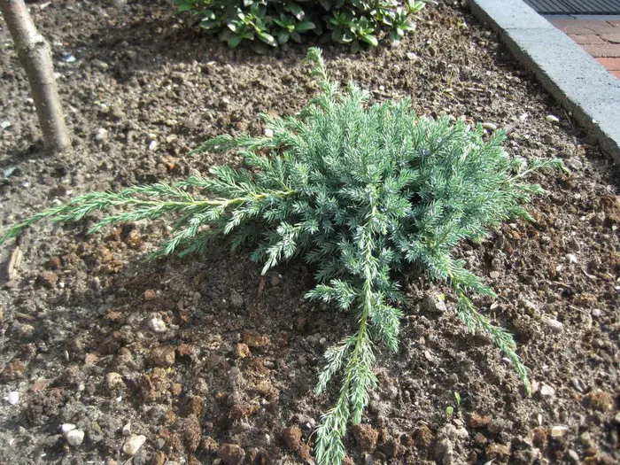 Juniperus squamata 'Blue Carpet' ist ein weit wachsender Bodendecker mit silberblauer Farbe.