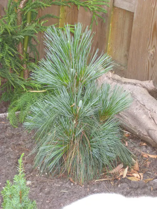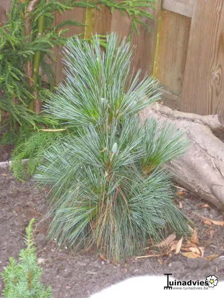 Pinus x schwerinii 'Wiethorst' ist eine aufrecht wachsende Zwergnadelbaum mit silbern/blaugrünen, weichen Nadeln.Produziert schon in jungen Jahren viele gelbe Zapfen.
