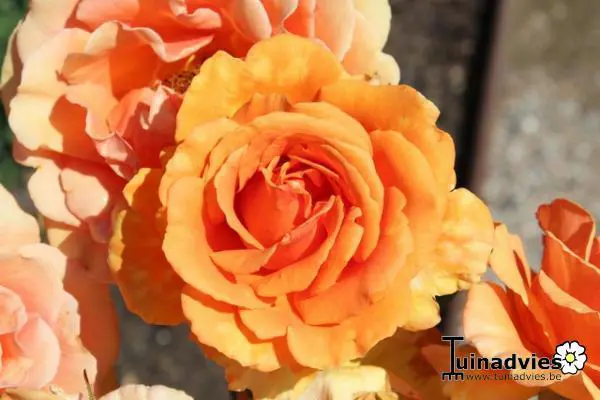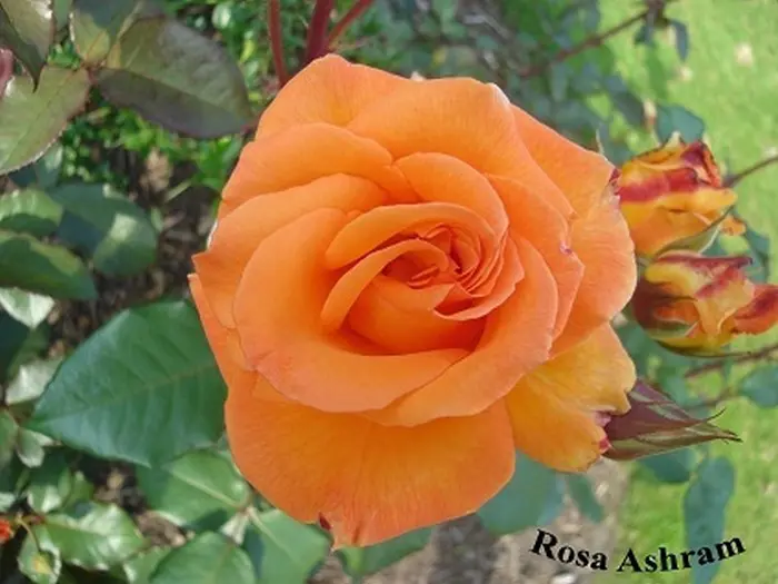 Rosa 'Ashram' blüht mit großen orange-kupferfarbenen Blüten.