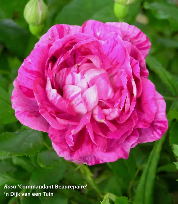 Rosa 'Commandant Beaurepaire' blüht mit violett/lila gestreiften, rosa Rose mit einigen weißen Flecken.