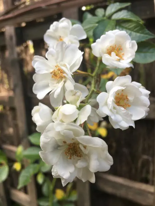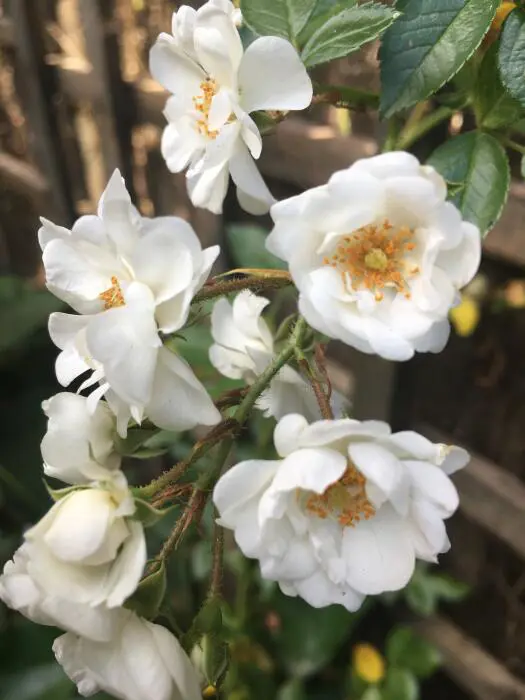 Rosa 'Paragon' ist eine stark duftende, wiederblühende Kletterrose mit großen Büscheln kleiner doppelter oder halb-doppelter weißer Blüten.