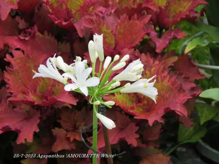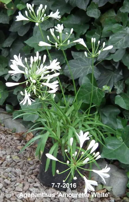 Agapanthus 'Amourette White' (AMOURETTE-Serie) hat schmale, dunkelgrüne Blätter und blüht üppig mit Dolden aus rein weißen, trompetenförmigen Blüten.