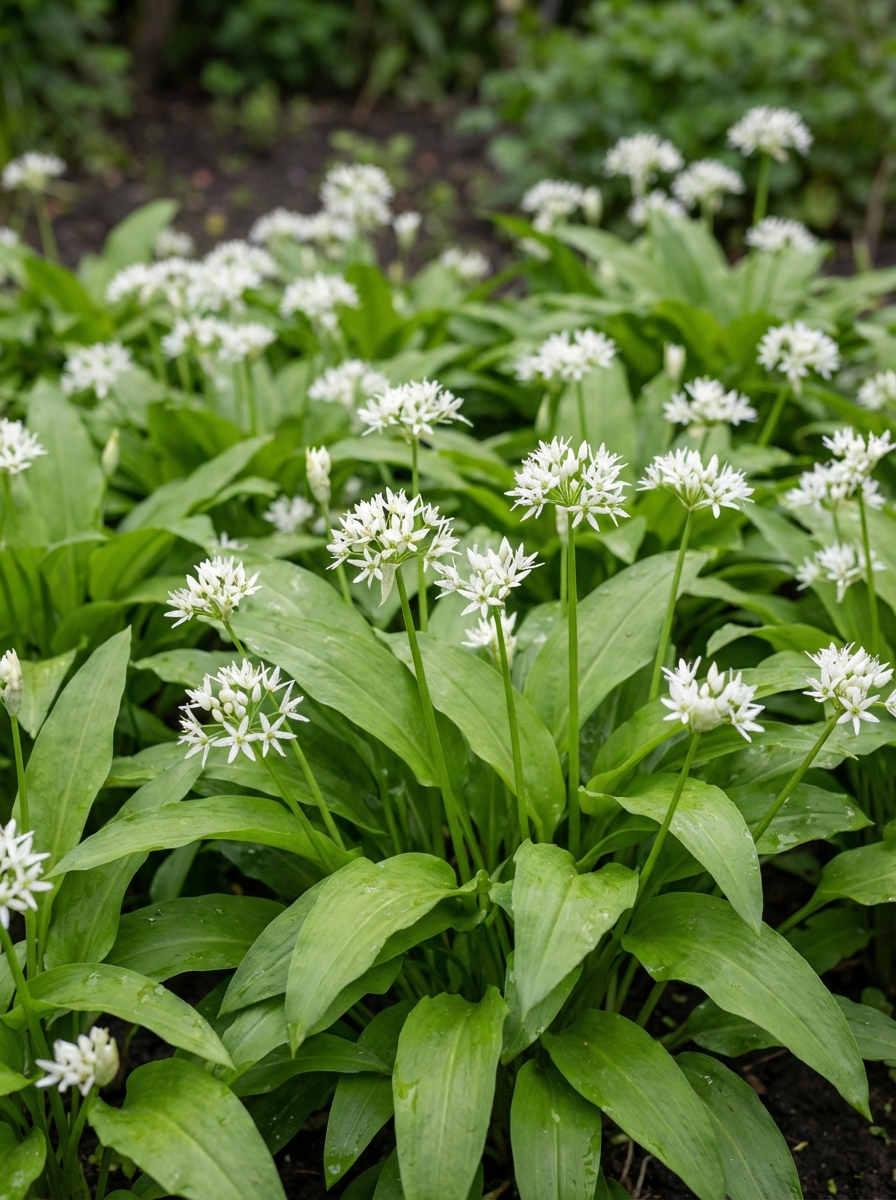 Allium ursinum ist eine bodendeckende knollige Pflanze mit linearen essbaren Blättern und aufrechten Stängeln sowie Umbeln duftender, sternförmiger, weißer Blüten mit starkem Zwiebel-/Knoblauchduft, aber einem weicheren Geschmack.