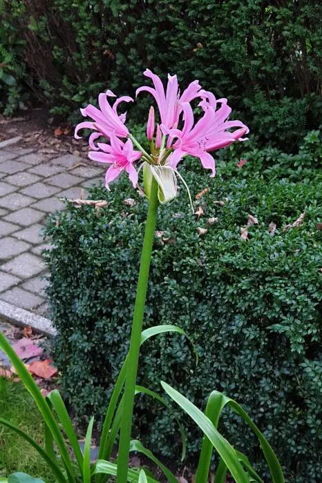 x Amarine tubergenii 'Belladiva Aphrodite' ist eine Kreuzung zwischen Nerine und Amaryllis. Blüht üppig mit großen, sanftrosa Blüten und dunkelrosa Streifen.