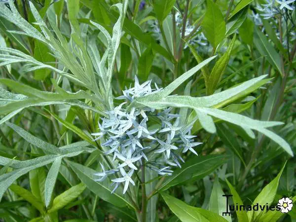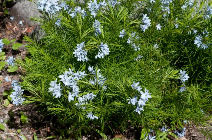 Amsonia ciliata blüht im Sommer mit Lichtrispen aus hellblauen, sternförmigen Blüten.