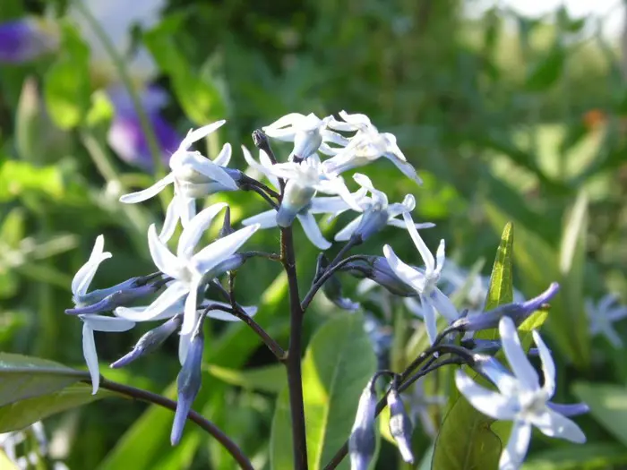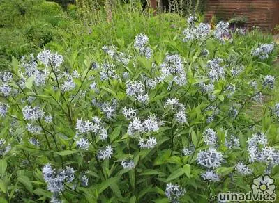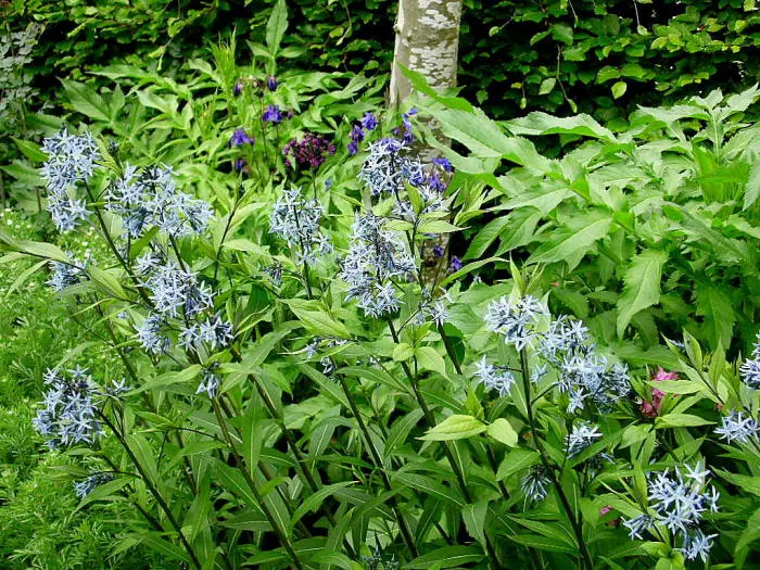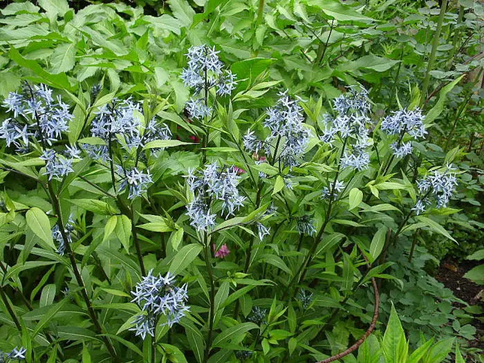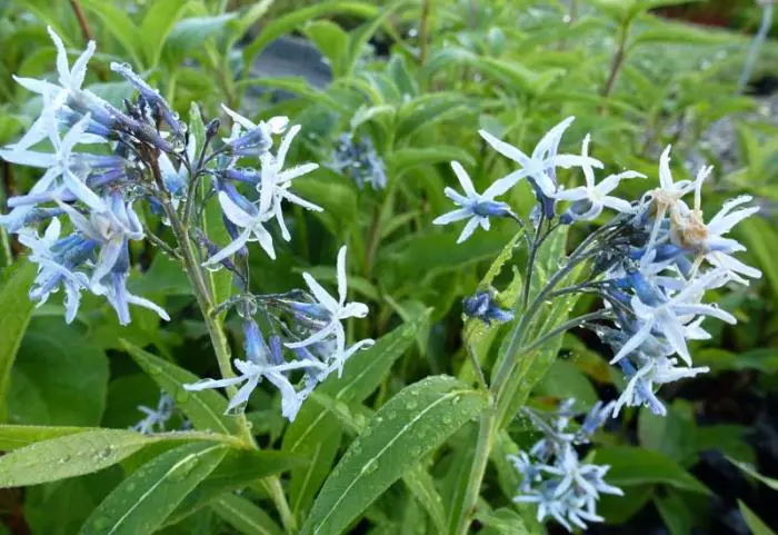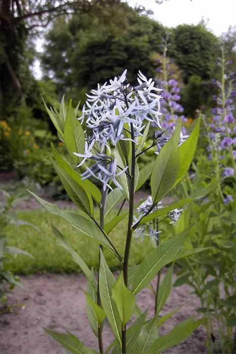 Stehend, mehrjährig mit leuchtend grünen, weidenartigen, elliptischen Blättern und losen Gruppen hellblauer Sternblüten an dunklen Stängeln.
