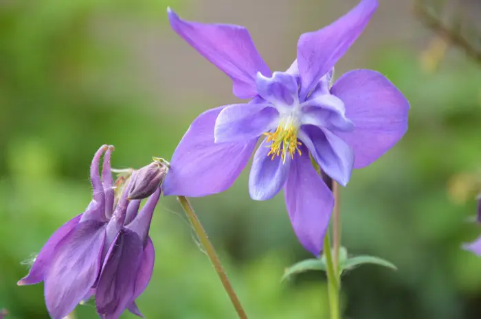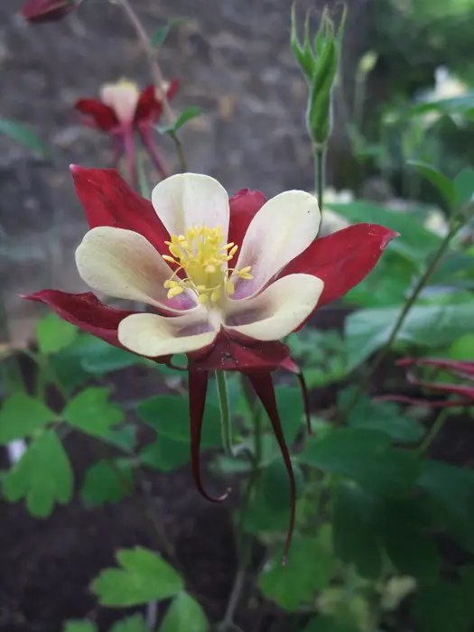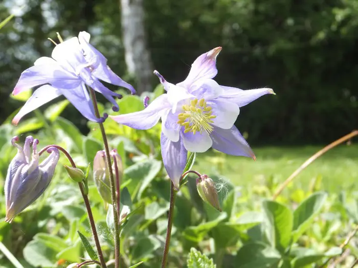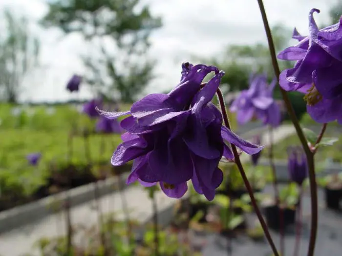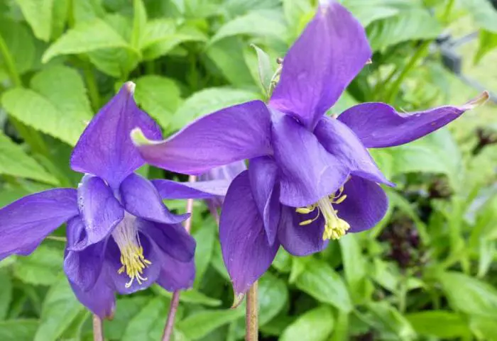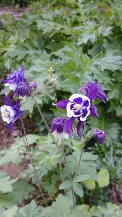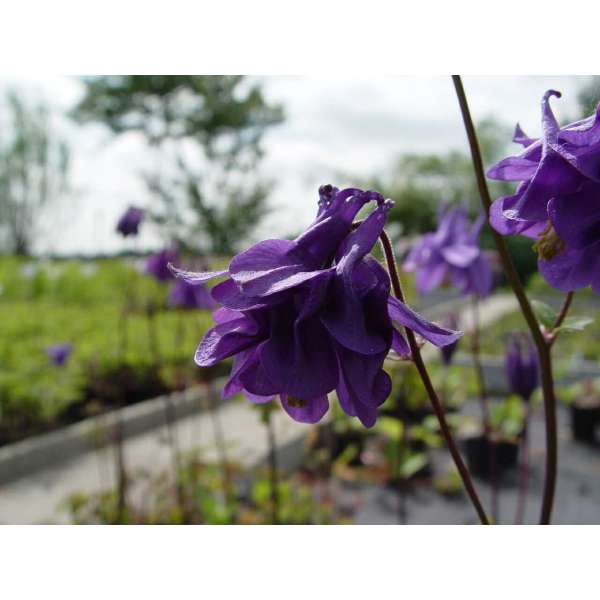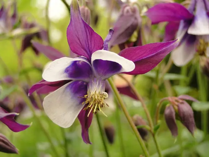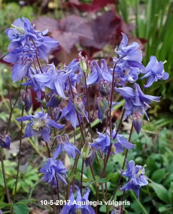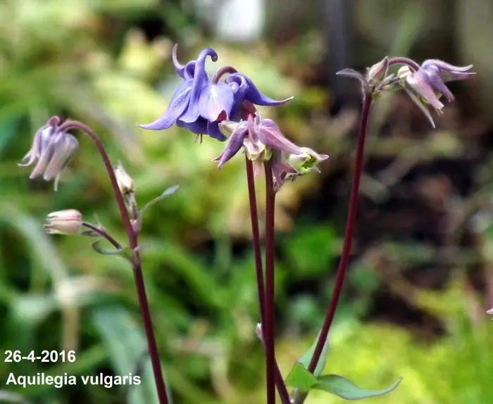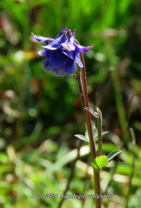 Aquilegia vulgaris sind sehr anmutige Stauden mit einzelnen dunkelvioletten Blüten und gespornten Blütenblättern.