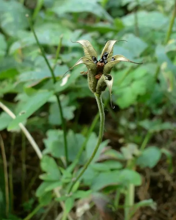 Die Stängel, steif, stark verzweigt, haben am Ende 5 bis 15 geknickte Blüten. Die Blätter sind blaugrün, rund und oft in zwei oder drei Lappen geteilt.