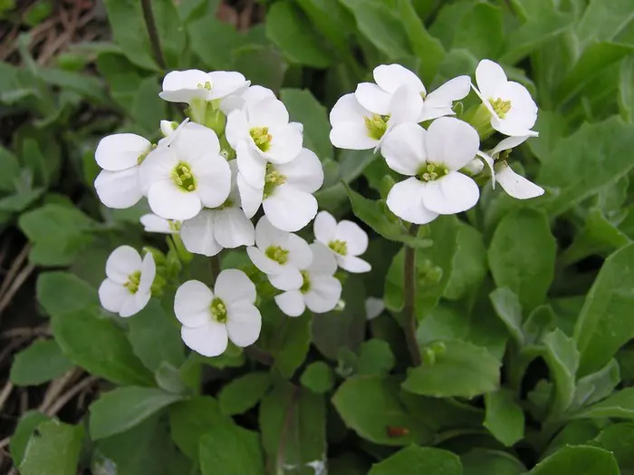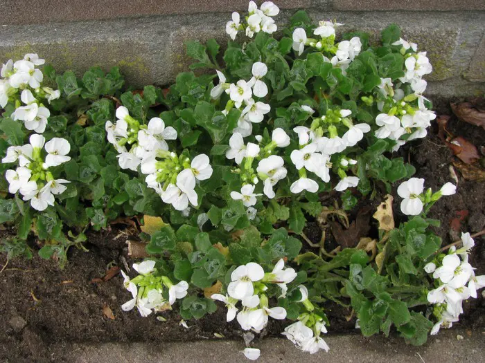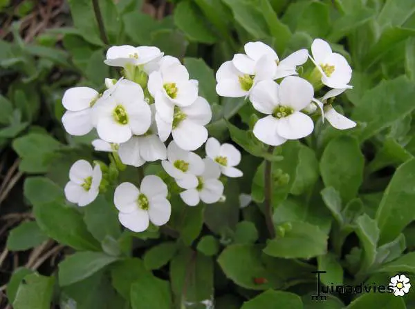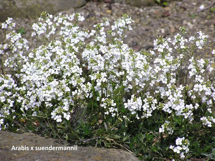 Arabis ist eine Gattung, von der es bis zu hundert Arten gibt (siehe Pflanzenleitfaden). Sie sind bekannte Frühlingsblumen für Steingärten und Mauern. Sie sind immergrün und bilden eine Polsterschicht aus graugrünen Blättern sowie weißen oder rosa Blüten.