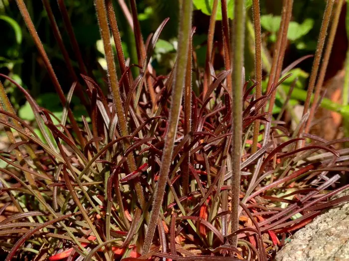 Armeria maritima 'Rubrifolia' bildet grasähnlichen Pollen aus schwarz-violetten, grasähnlichen Blättern, die im Sommer und Herbst grün und bronzegrün werden.