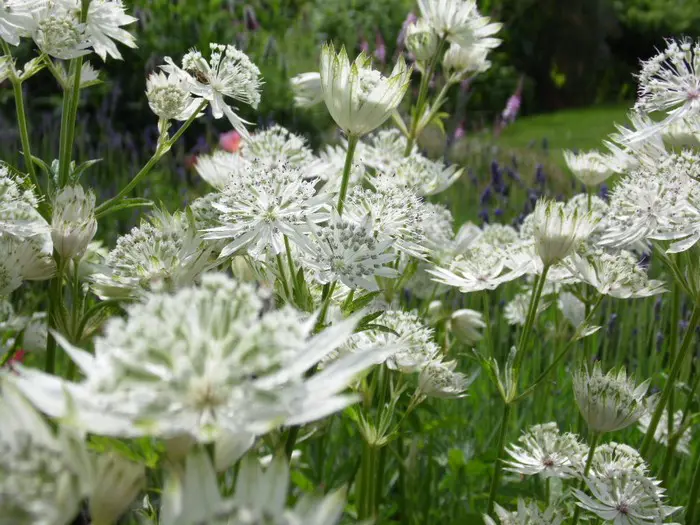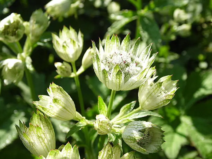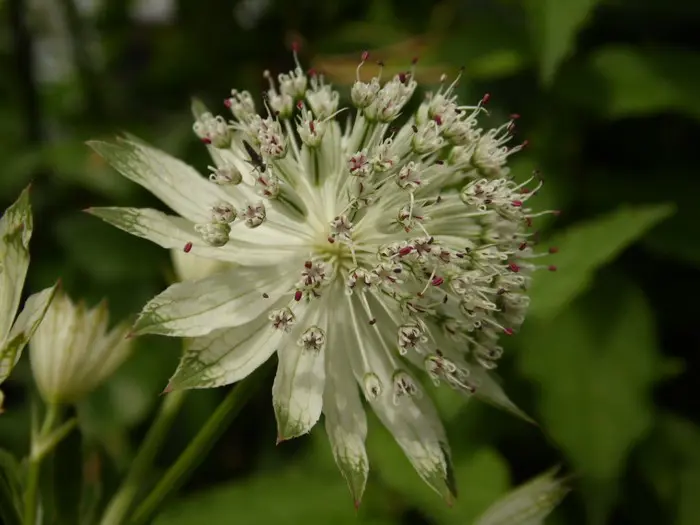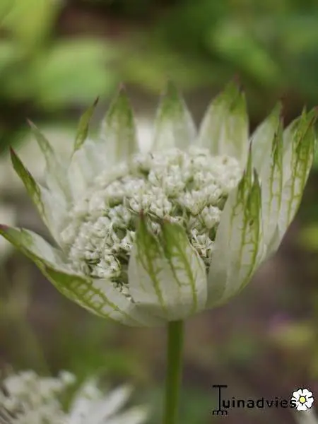 Astrantia major 'Superstar' ist eine sehr hohe Sorte mit wunderschönen, fein strukturierten großen weißen Blüten und grünen, fein geäderten, weißen Hochblättern.