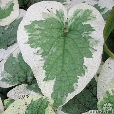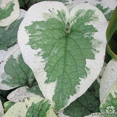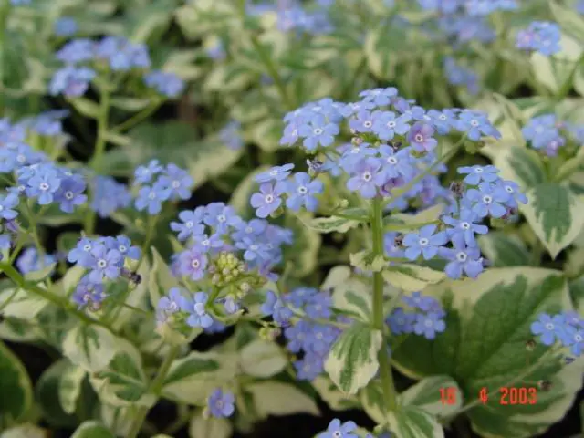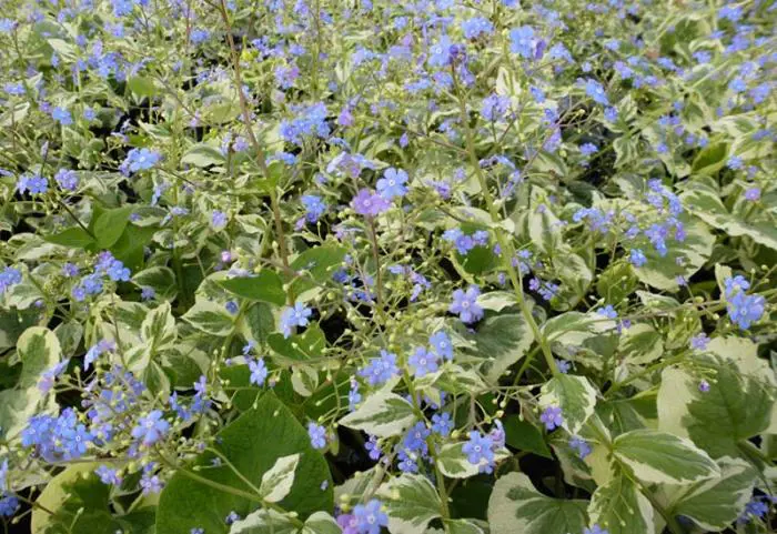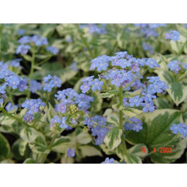 Brunnera macrophylla 'Variegata' ist ein buschiger Bodendecker mit großen, runden, weiß umrandeten leuchtend grünen Blättern und einer Wolke kleiner blauer Blüten an feinen Stängeln. Die Blumen ähneln sehr denen des gewöhnlichen Vergissmeinnicht sowie der amerikanischen Vergissmeinnicht oder der Omphalodes verna