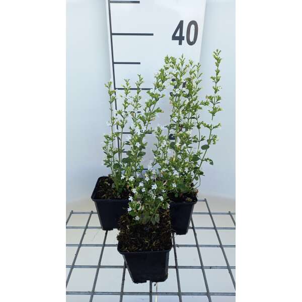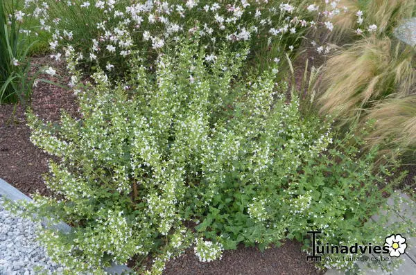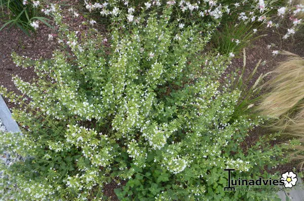 Bildet eine buschige, niedrige Pflanze, die üppig mit weißen Blüten blüht.