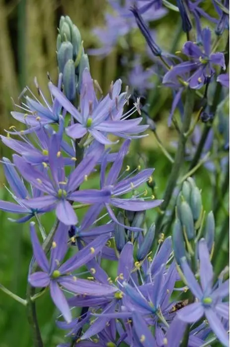 Camassia leichtlinii 'Caerulea' ist eine mehrjährige, knollige Pflanze, die recht schnell wächst und mit hochblühenden Stängeln blüht, die mit violettblauen, sternförmigen Blüten und langen gelben Staubblättern bedeckt sind.