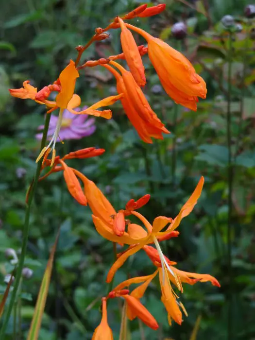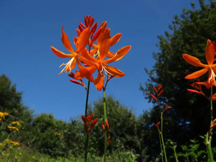 Crocosmia aurea 'Golden Ballerina' ist eine auffallend hohe Montbretia. An den gebogenen Stängeln blühen die Blüten mit schmaleren und leicht zurückgezogenen Blütenblättern in einer gleichmäßigen goldgelb-orangen Farbe.