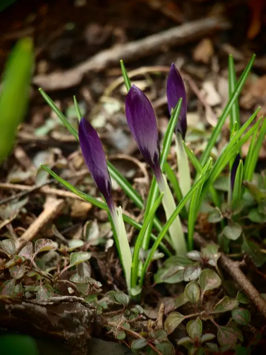 Ein tiefvioletter Krokus, der die Blätter nach der Blüte absterben lässt
