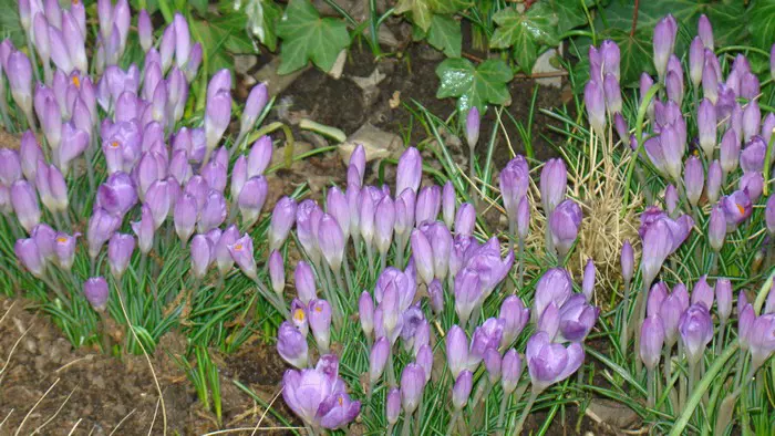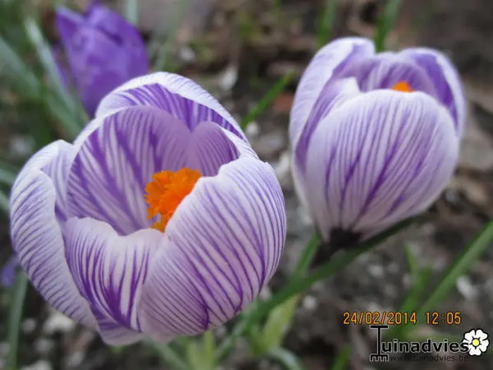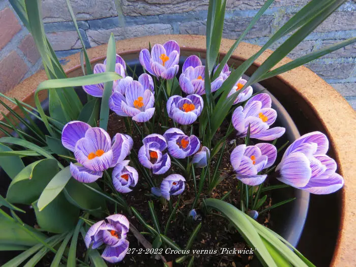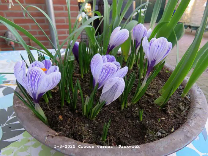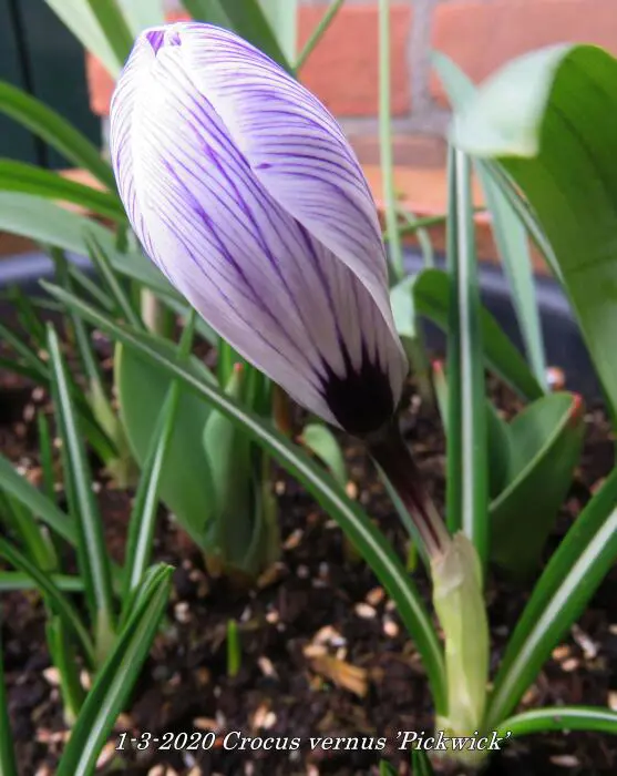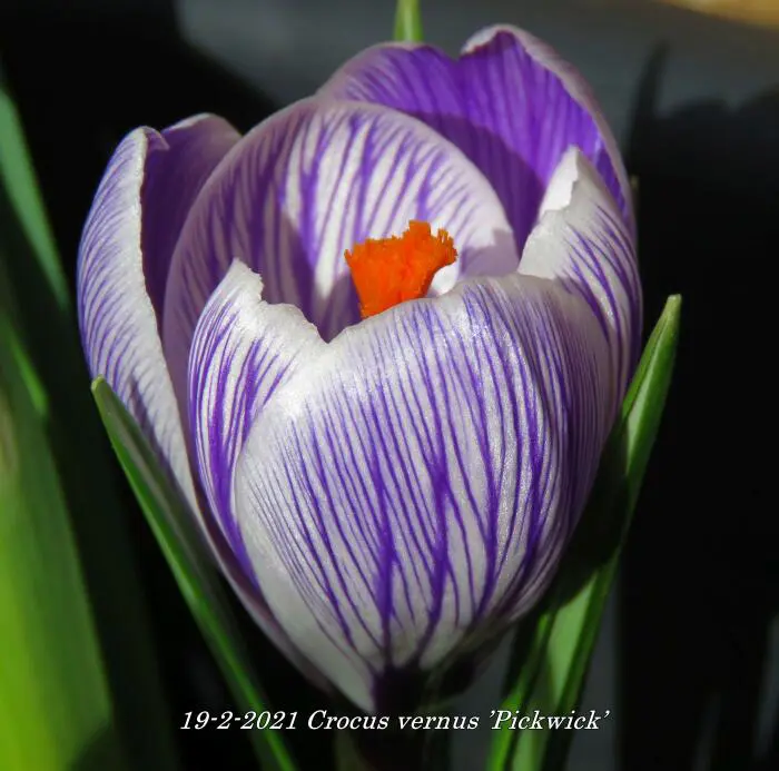 Crocus vernus Pickwick blüht mit großen, kelchförmigen Blüten, weiß/silberlila und dunkellila Adern.