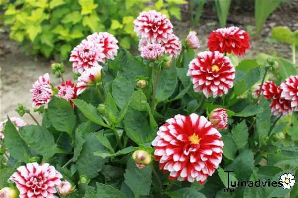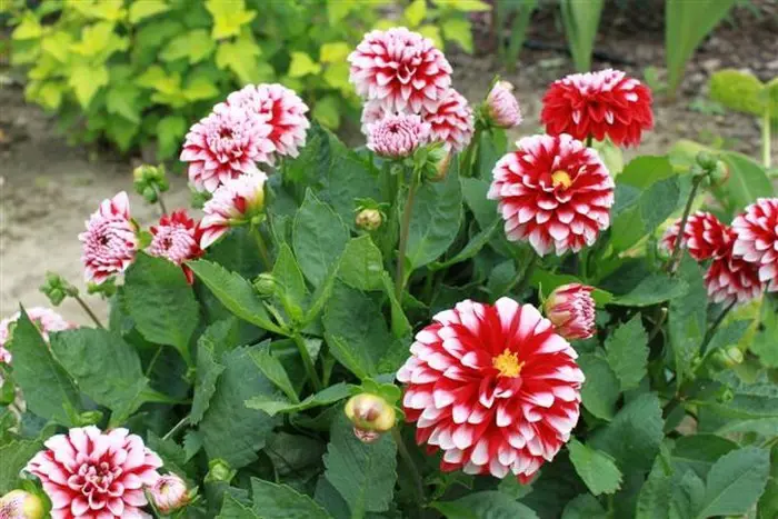 Dahlia 'Little Tiger' ist eine dekorative Dahlie mit gut gefüllten Blüten und breiten, flachen roten Blütenblättern mit weißen Spitzen.