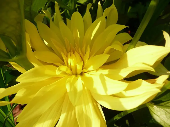 Dahlia 'München' ist eine halbkakteene Dahlia mit gut gefüllten, leuchtend gelben Blüten. Die Blütenblätter sind teilweise zusammengerollt.