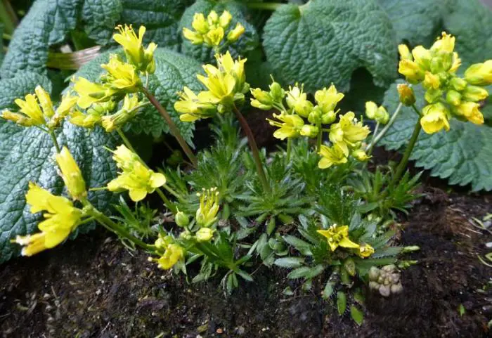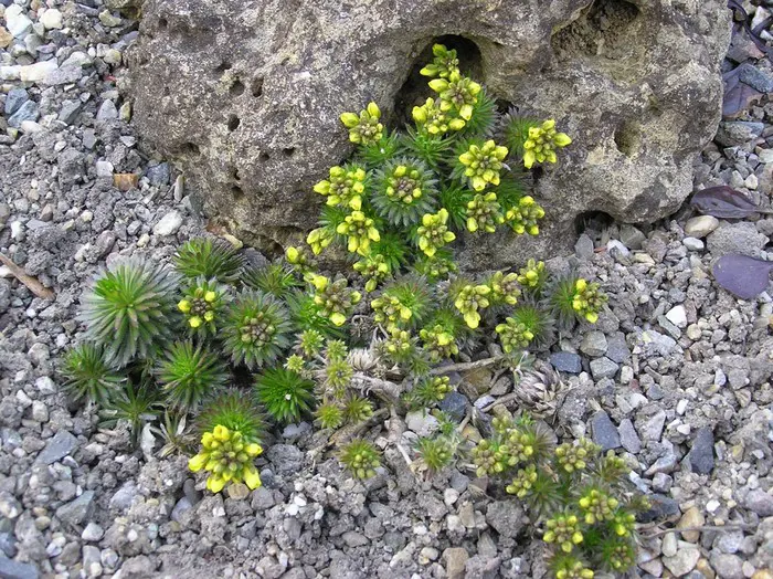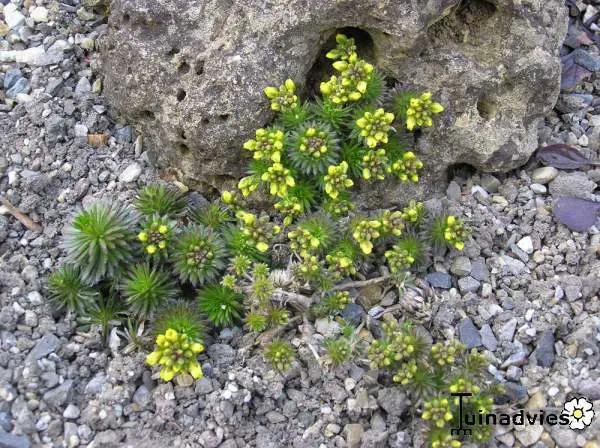 Draba aizoides wächst in Pollen aus kahlen Stängeln mit Büscheln leuchtend gelber Blüten an den Spitzen. Die Blätter bilden unten Rosetten.Eignet sich sehr gut für den Steingarten oder um zwischen den Fugen von Trockenmauern zu wachsen.
