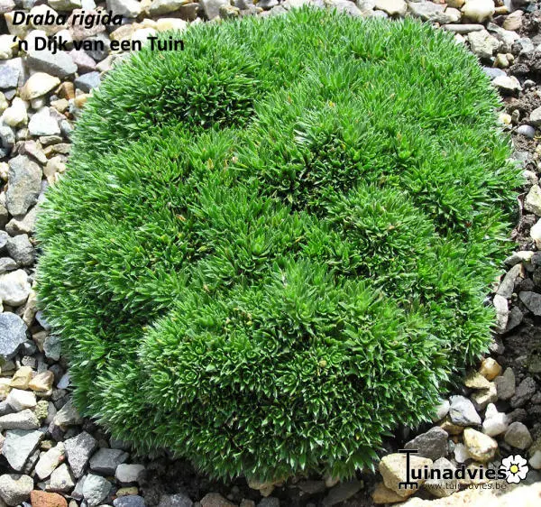 Draba rigida bildet ein dichtes Polster aus kleinen, dichten Rosetten aus linearen, dunkelgrünen Blättern mit behaarten Rändern.