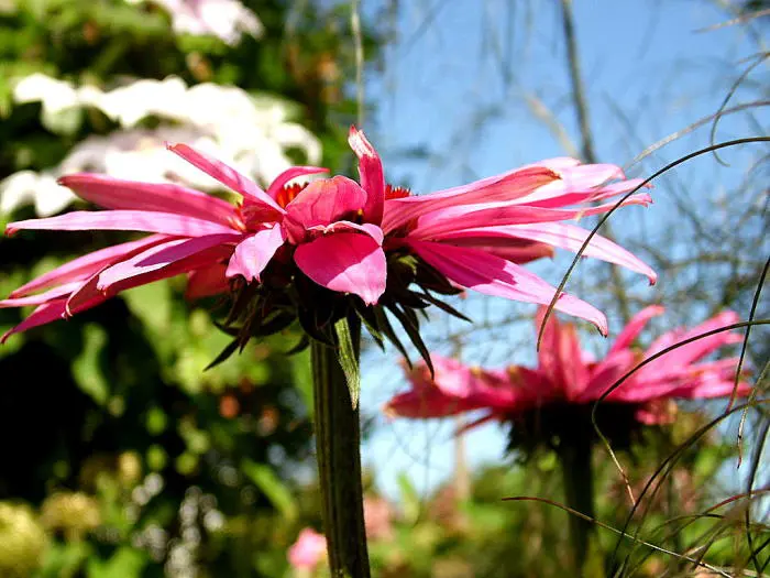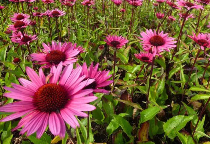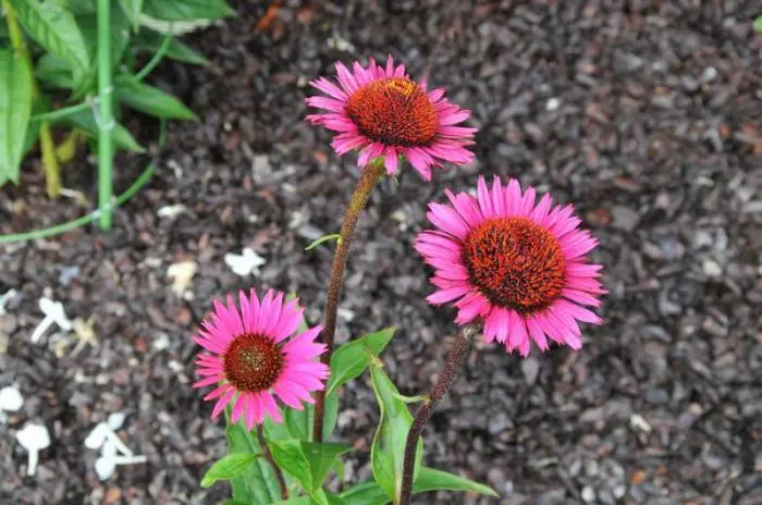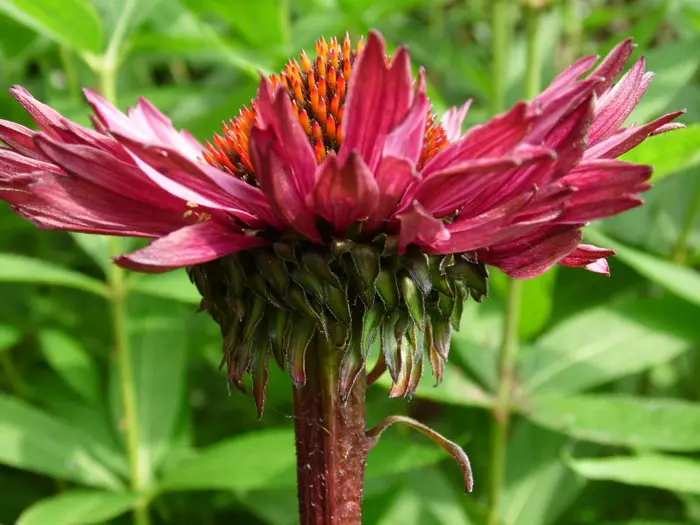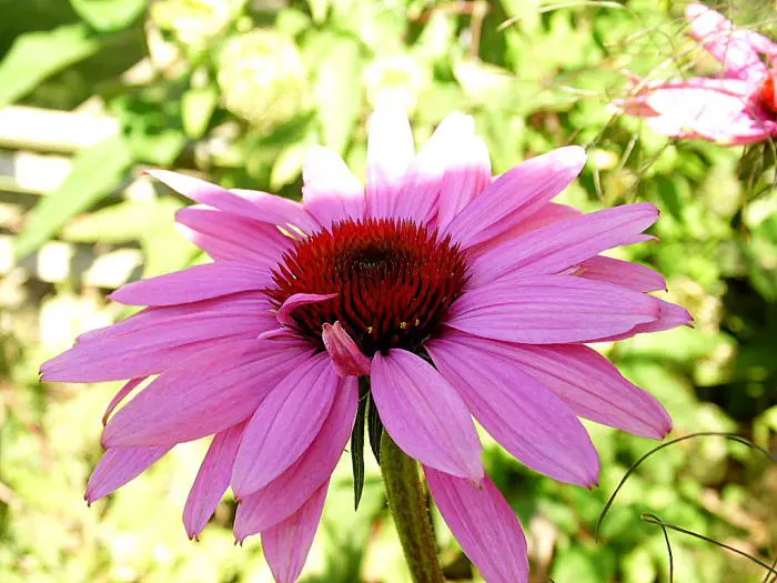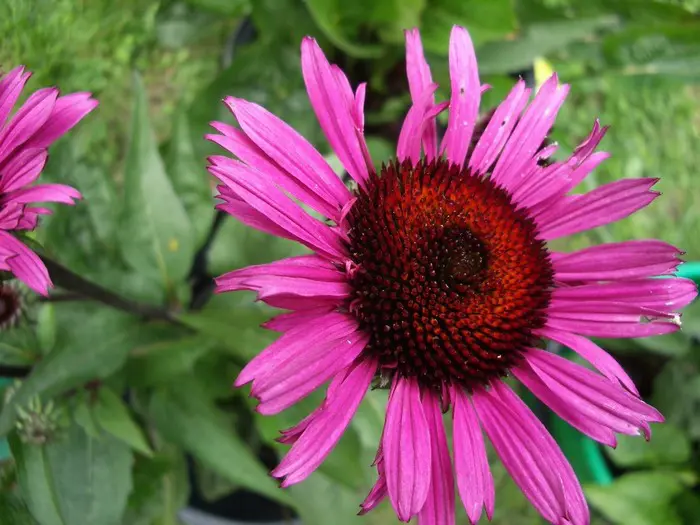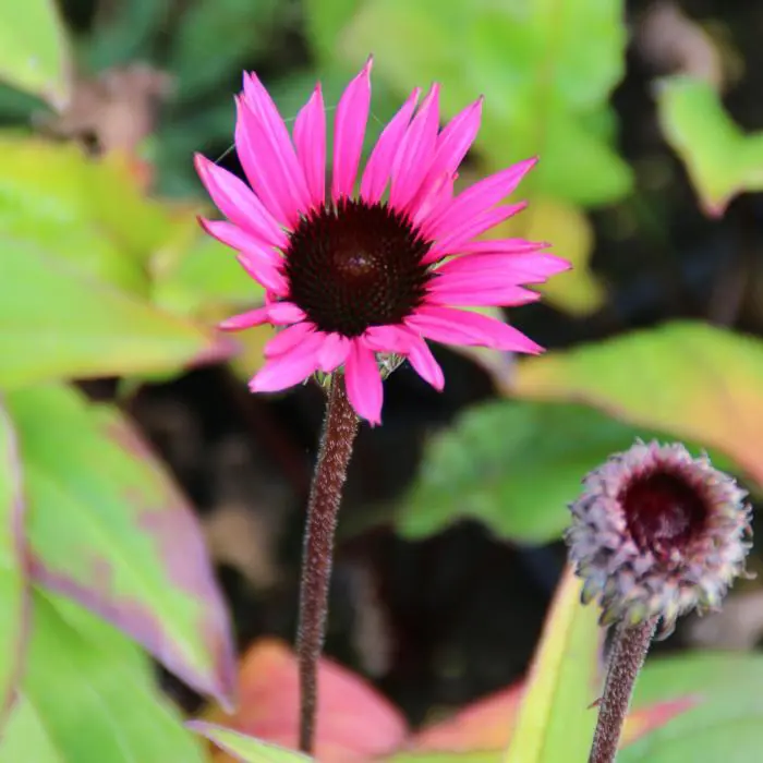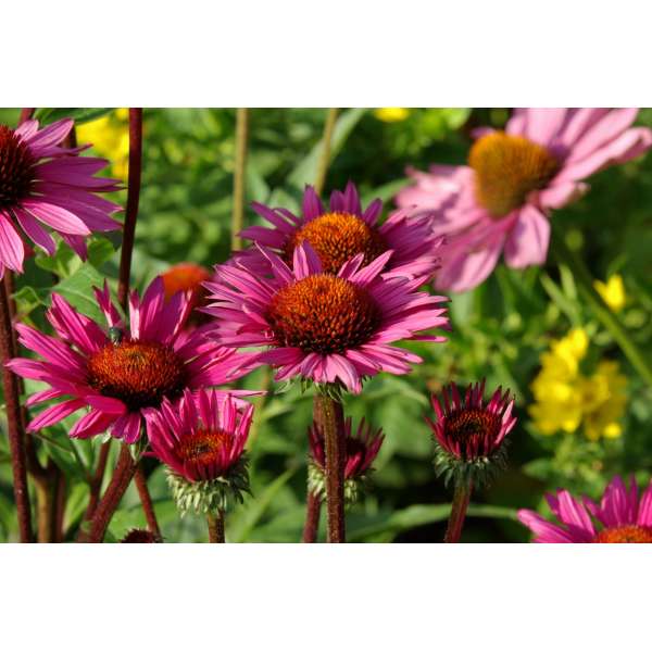 Echinacea purpurea 'Fatal Attraction' ist ein wunderschöner Sonnenhut mit kräftigen, fast schwarzen Stängeln und magentaquefarbenen Blüten mit orange-rotem Zentrum.