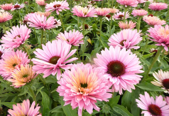 Echinacea SunSeekers ist eine Serie des roten Perlenblumers. Sie sind stark verzweigte Pflanzen mit schöneren Blättern und reicheren Blüten, deren Blüten nicht verblassen.