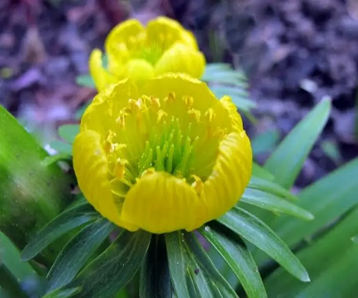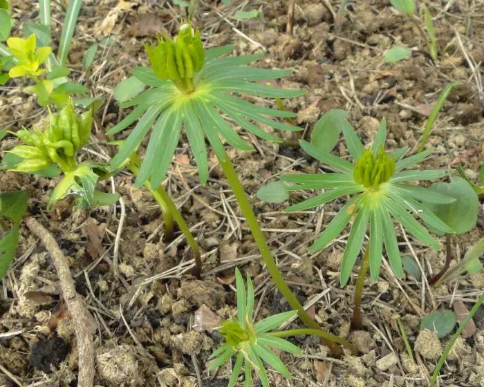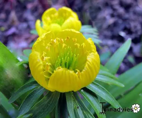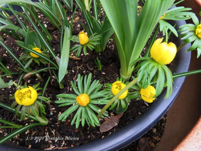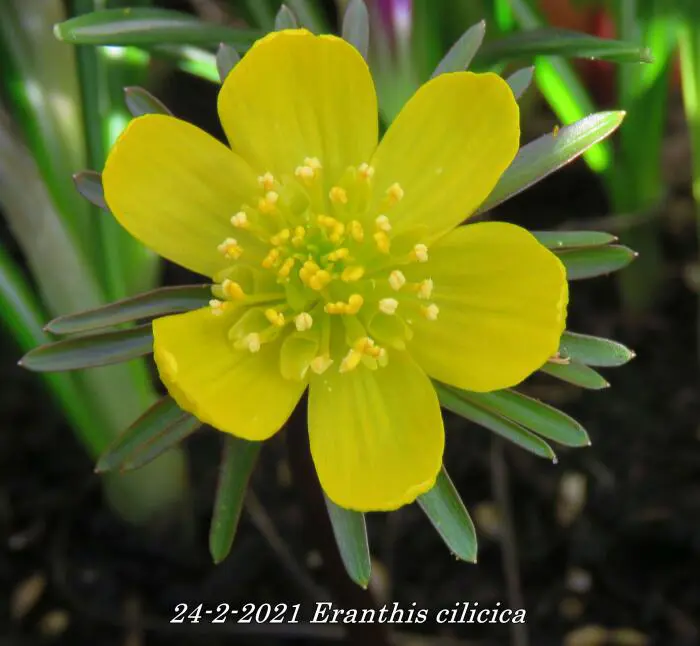 Eranthis cilicica hat größere Blüten als die Eranthis hyemalis, und die umhüllten Blätter sind kleiner. Die Blattfarbe ist bronzegrün.
