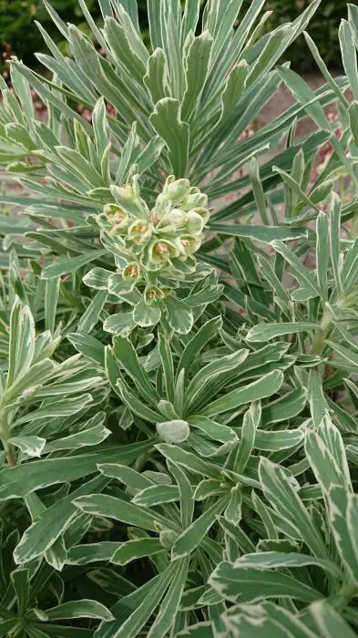 Euphorbia amygdaloides 'Frosted Flame' ist eine buschige, aufrecht wachsende Pflanze mit cremeweiß umrandeten, graugrünen Blättern, die bei kühlerem Wetter einen roten Schimmer annehmen.