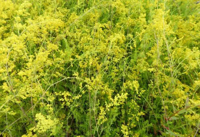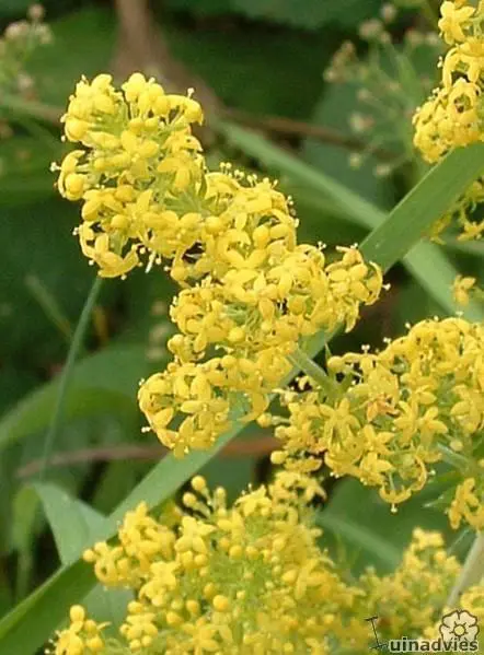 Die Blüte ist goldgelb oder zitronengelb und hat eine Größe von 2–4 mm. Die Kronlippen haben eine feine Schneidspitze und eine gerollte Kante. Die Unterseite der Blüte ist behaart. Die Blumen haben einen honigähnlichen Duft. Der Blütenstand ist eine Spitze. Die Blüten bilden Umbels, die zusammen eine Art Rispe bilden. Die Art blüht von Juni bis Herbst. Die Frucht ist eine zweiteilige geteilte Frucht, die haarlos ist und eine Länge von 1–1,5 mm erreicht. Die Reife der Frucht lässt sich an ihrer Farbe messen: Sobald sie schwarz ist, ist die Frucht reif.
