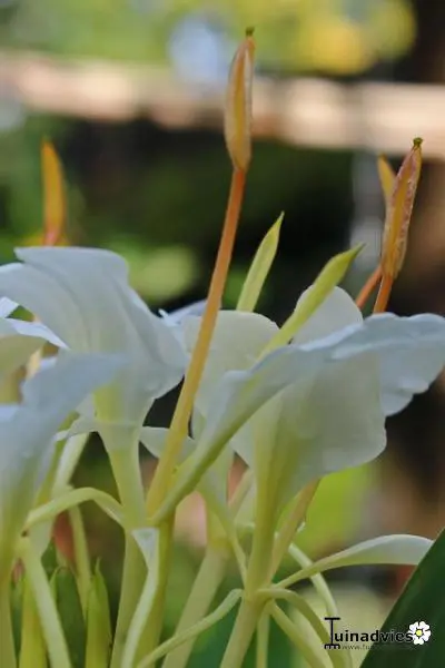 Hedychium 'Corelli' (H. coronarium x H. ellipticum) bildet große Blätter und blüht mit wunderbar duftenden weißen Blüten. Die auffälligen orange-gelben Staubblätter verleihen der Blume etwas Besonderes.