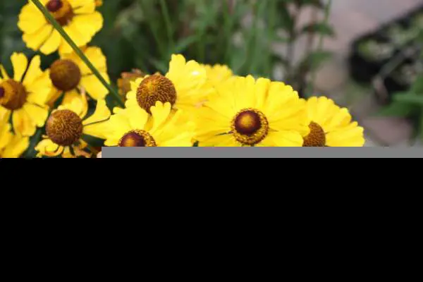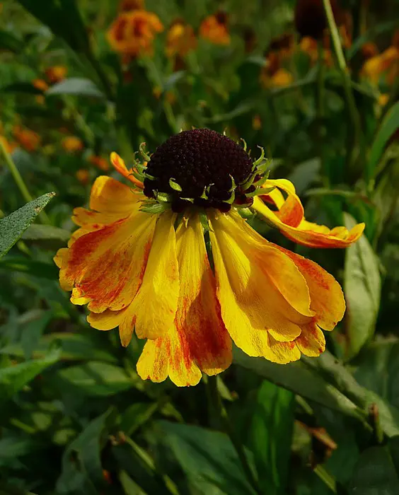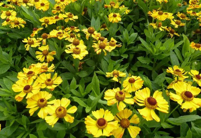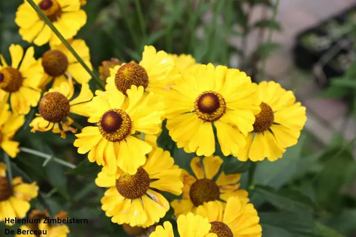 Helenium 'Zimbelstern' blüht mit großen, auffälligen Blüten, honiggelb/bernsteingelb mit leicht orangefarbenen Streifen.