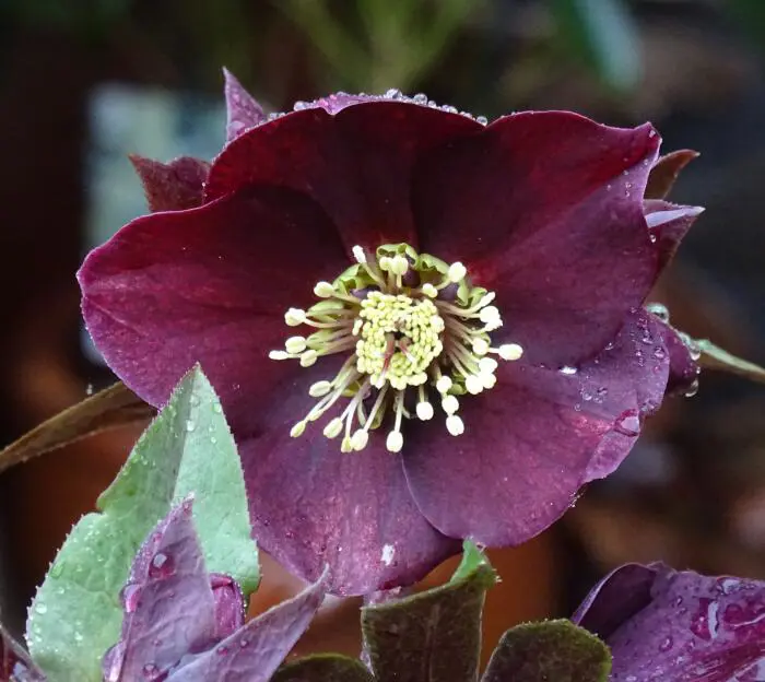Helleborus 'Star of Love' blüht üppig mit tiefroten Blüten, die einen schönen Kontrast zu den dunkelgrünen Blättern bilden.