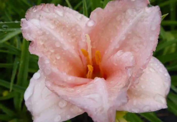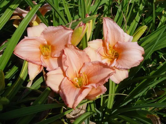 Hemerocallis 'On and On' ist eine sehr niedrige Taglilie von 30 cm, die hellrosa blüht.