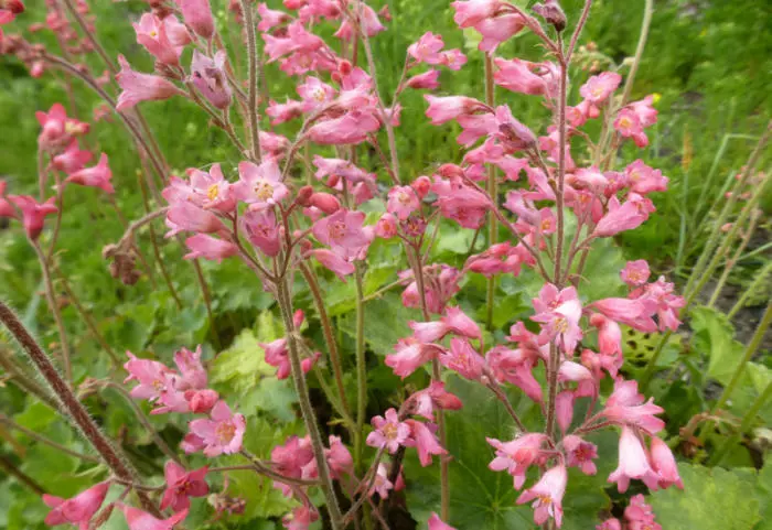 Heuchera sanguinea 'Bressingham Hybrids' hat herzförmige grüne Blätter und blüht mit Rispen aus glockenförmigen Blüten in Karmesinrot, Korallen oder Creme.