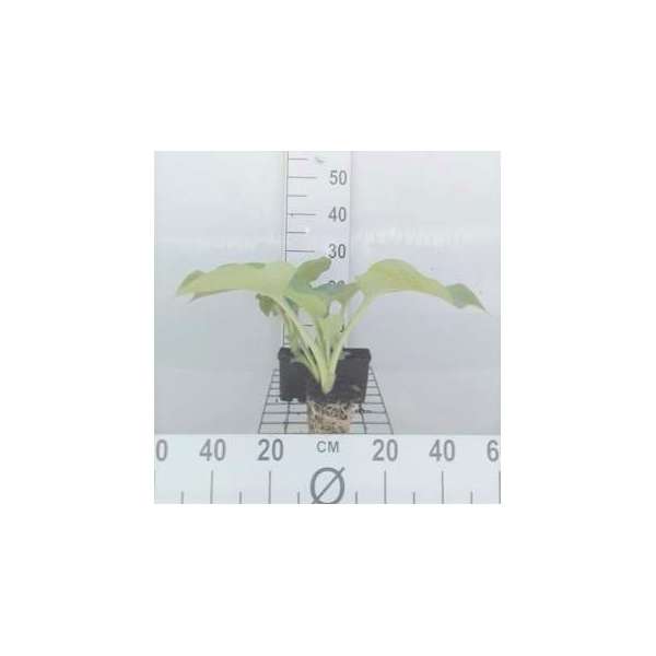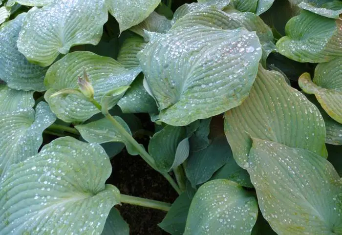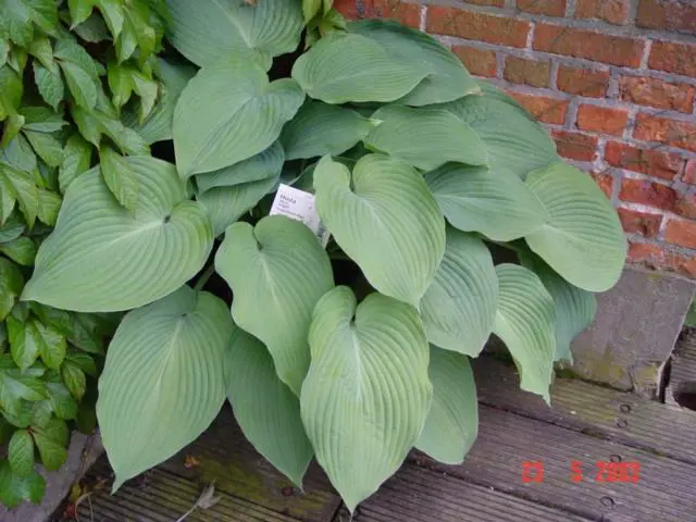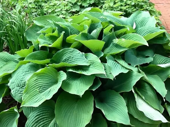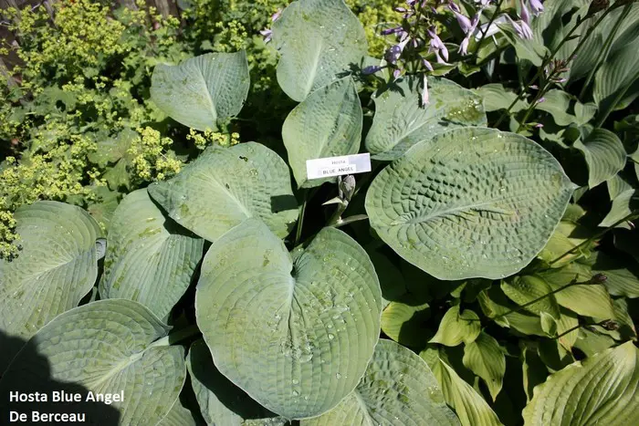 Hosta 'Blue Angel' hat ein sehr großes blau-grünes Blatt mit weißen Blüten.